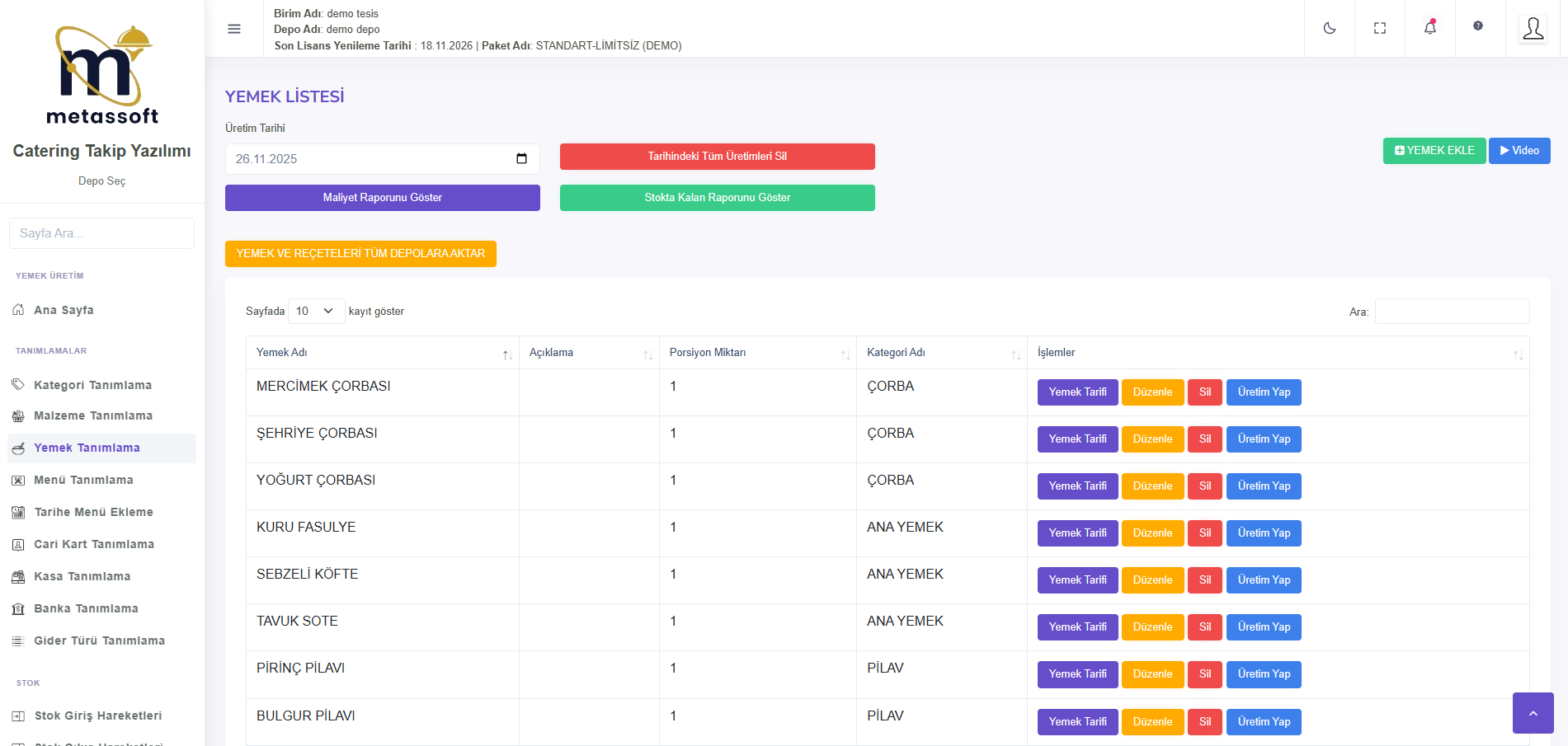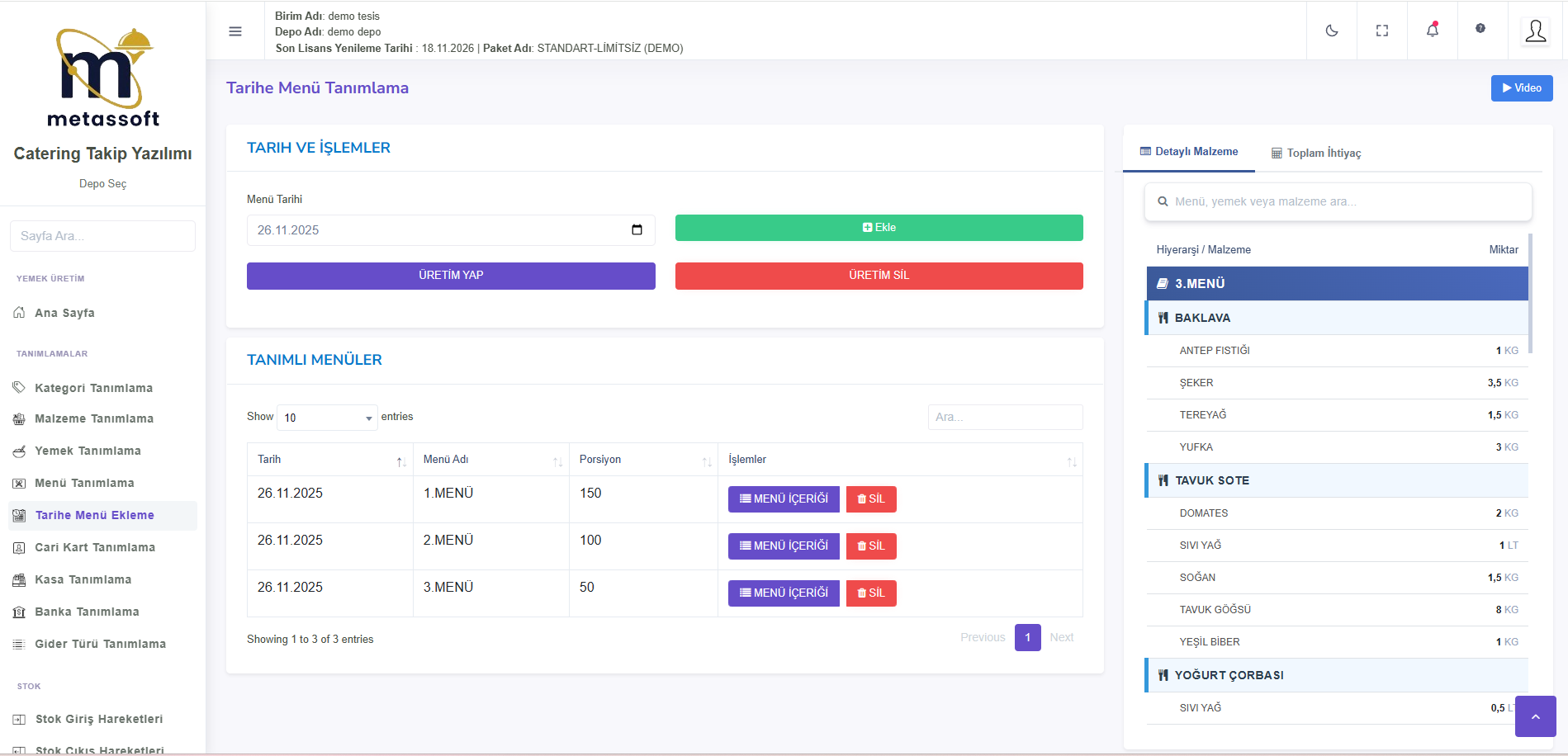 Bu modül sayesinde her tarih için üretilecek menüler önceden planlanabilir. Planlanan menüler toplu üretim sürecine dahil edilerek, sistemli ve verimli bir üretim akışı sağlanır. Tüm bu işlemler, hem mutfak hem de mali yönetim süreçlerinin düzenli ve kontrollü bir şekilde yürütülmesine olanak tanır.