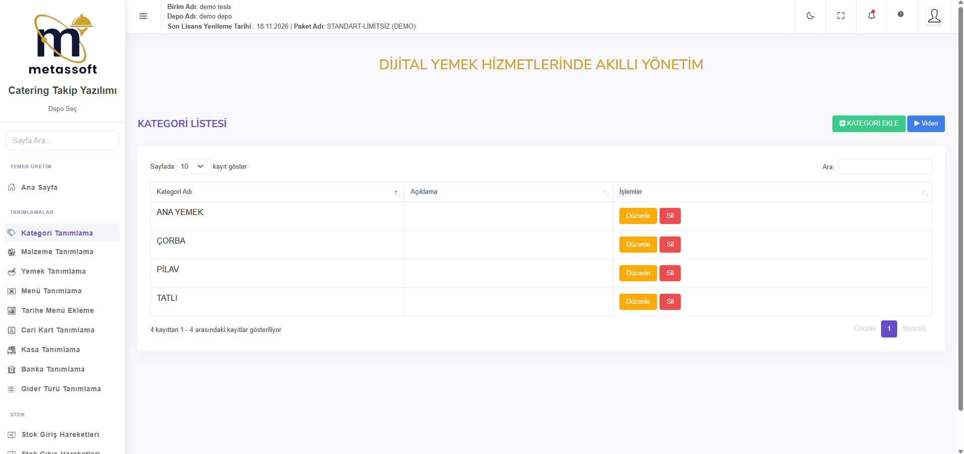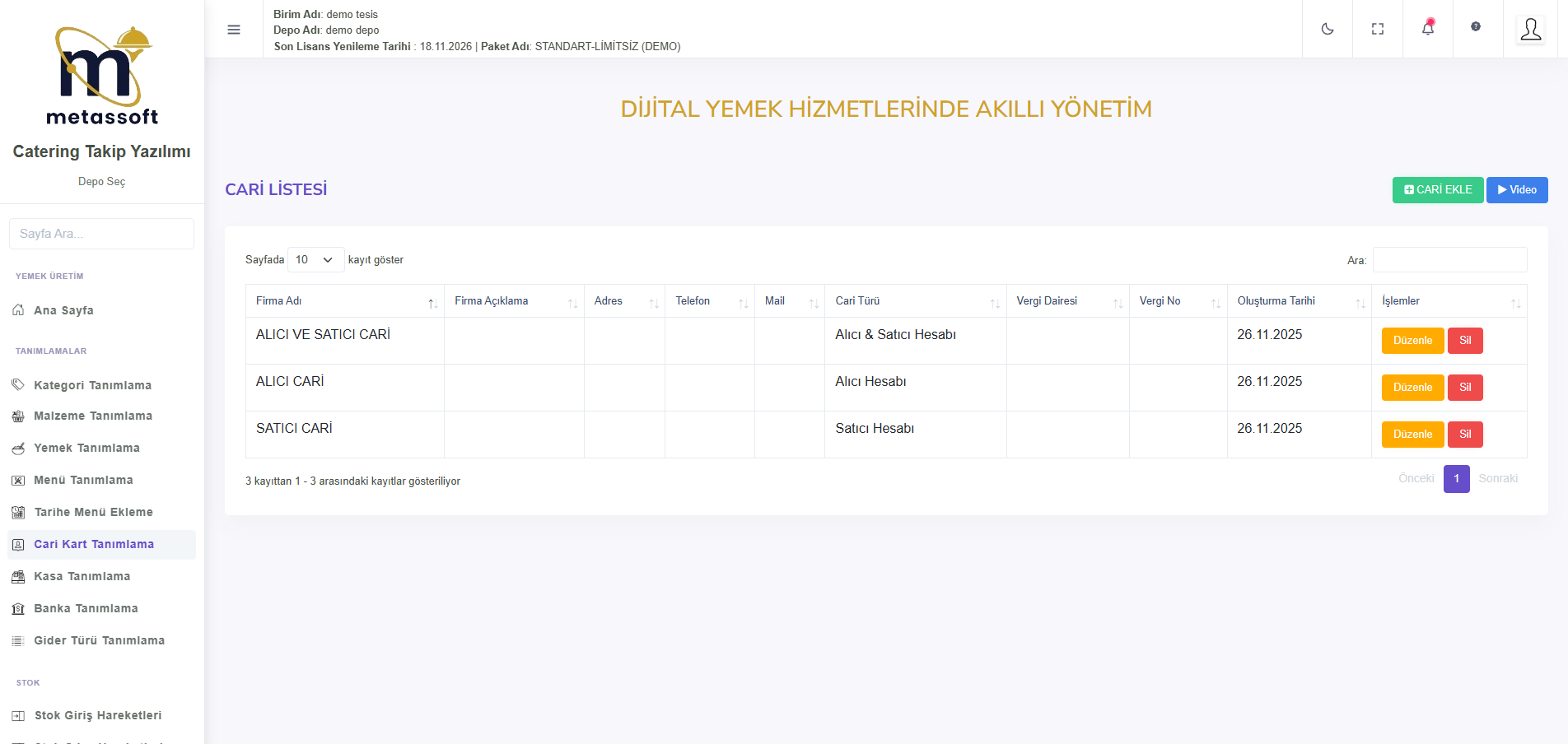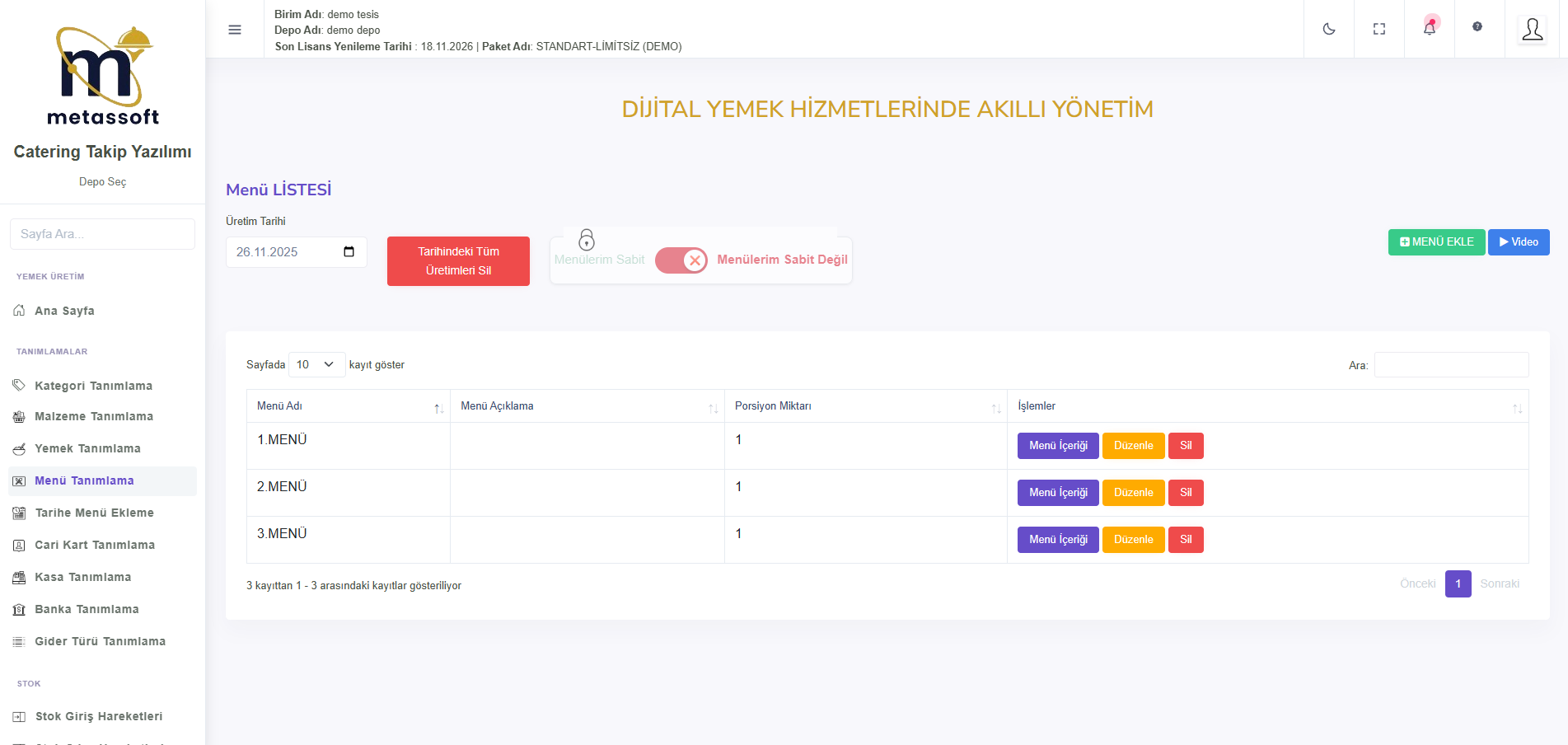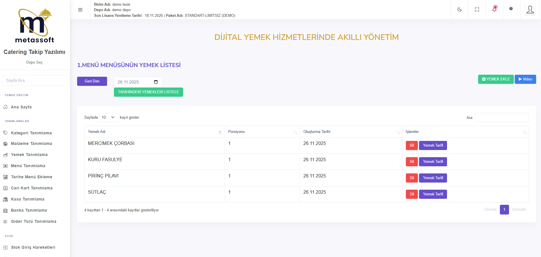 Sonrasında menü tanımlamaları yapılır. Menülerin içerisine daha önce tanımlanan yemekler eklenerek günlük veya dönemsel menü planlaması yapılabilir. Ayrıca sistemde cari tanımlamaları gerçekleştirilerek tedarikçi veya müşteri bilgileri sisteme girilir. Kasa ve banka tanımlamalarıyla birlikte finansal işlemler için kullanılacak kaynaklar belirlenir. Aynı zamanda, gider türleri tanımlanarak harcama kalemlerinin sınıflandırılması sağlanır.