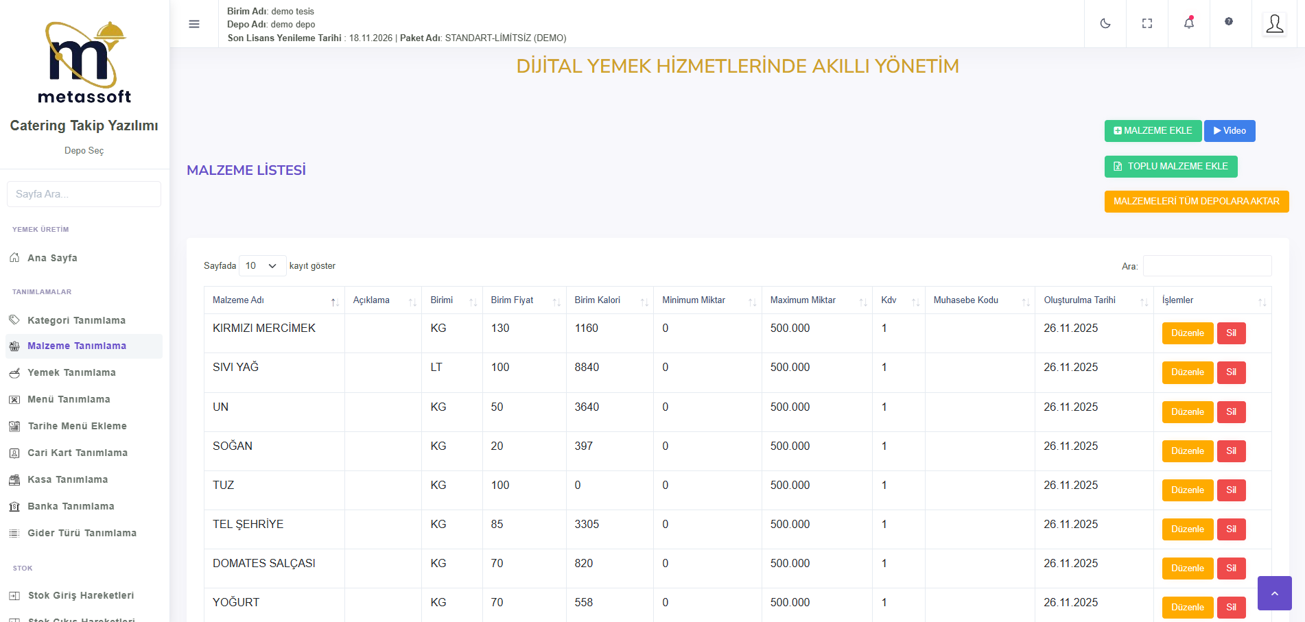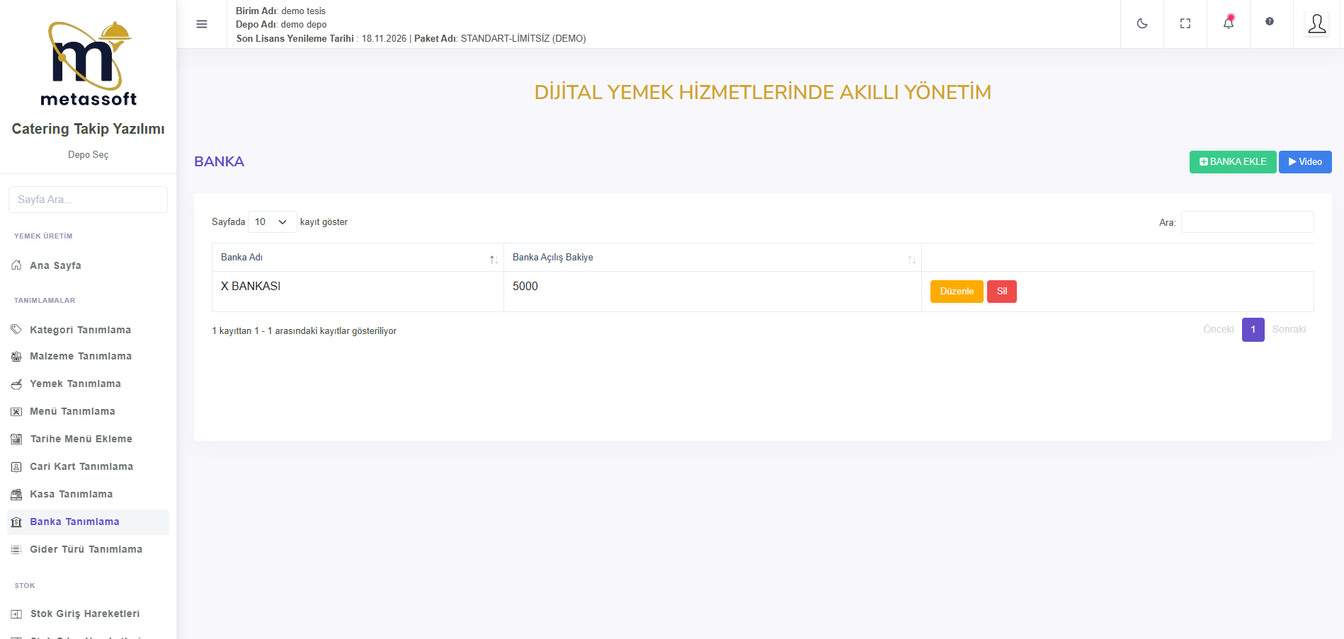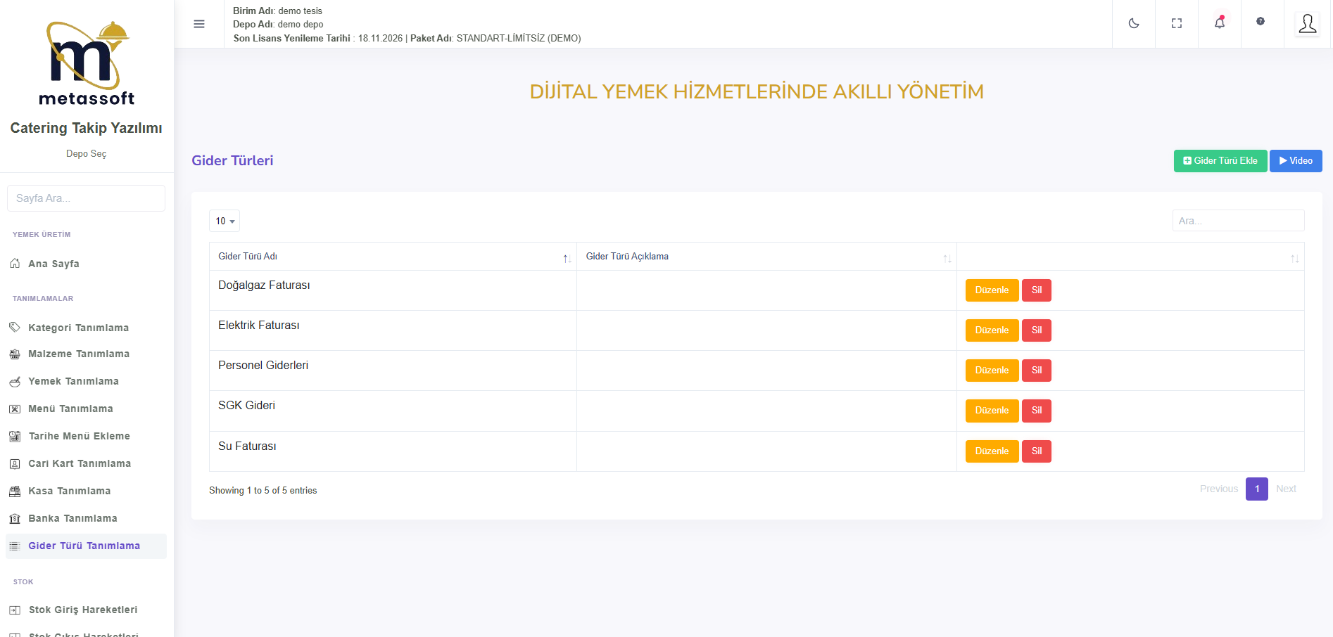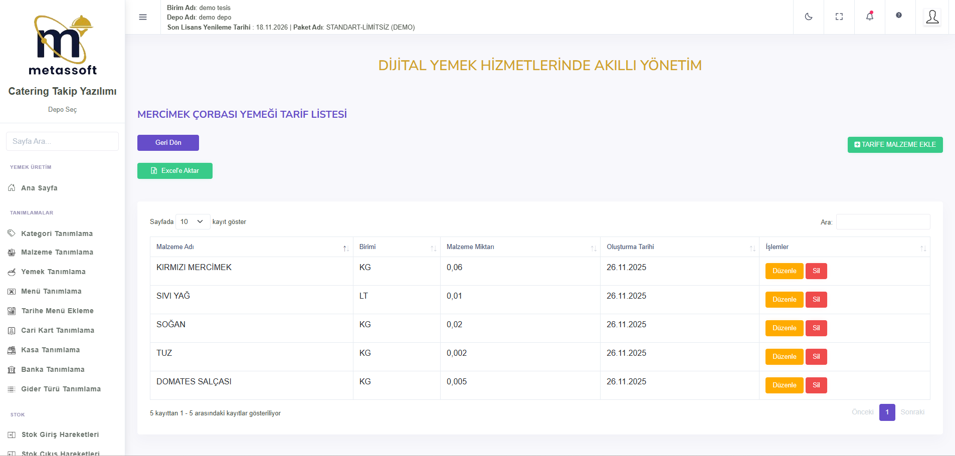Sonrasında menü tanımlamaları yapılır. Menülerin içerisine daha önce tanımlanan yemekler eklenerek günlük veya dönemsel menü planlaması yapılabilir. Ayrıca sistemde cari tanımlamaları gerçekleştirilerek tedarikçi veya müşteri bilgileri sisteme girilir. Kasa ve banka tanımlamalarıyla birlikte finansal işlemler için kullanılacak kaynaklar belirlenir. Aynı zamanda, gider türleri tanımlanarak harcama kalemlerinin sınıflandırılması sağlanır.