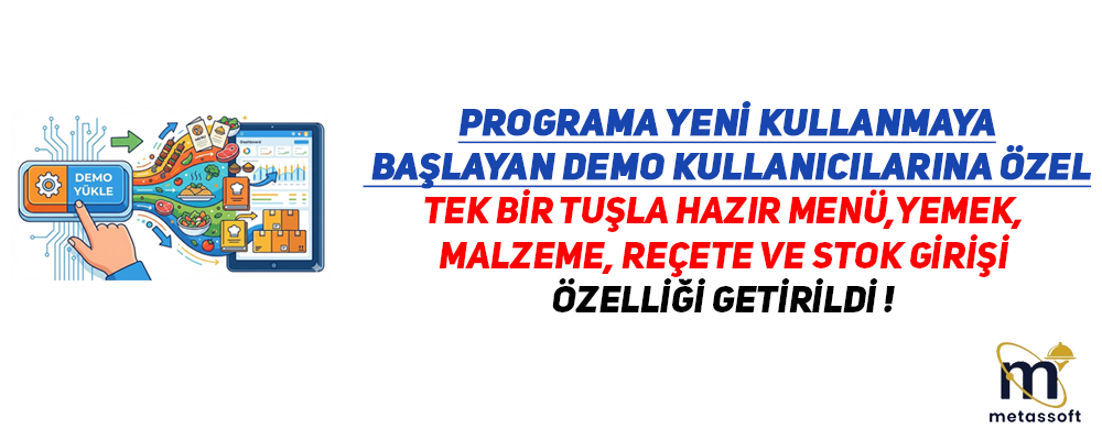 Demo kullanıcıları artık tek bir tuşla hazır yemekleri, malzemeleri, menüleri, reçeteleri ve stok girişlerini otomatik olarak yükleyebiliyor.