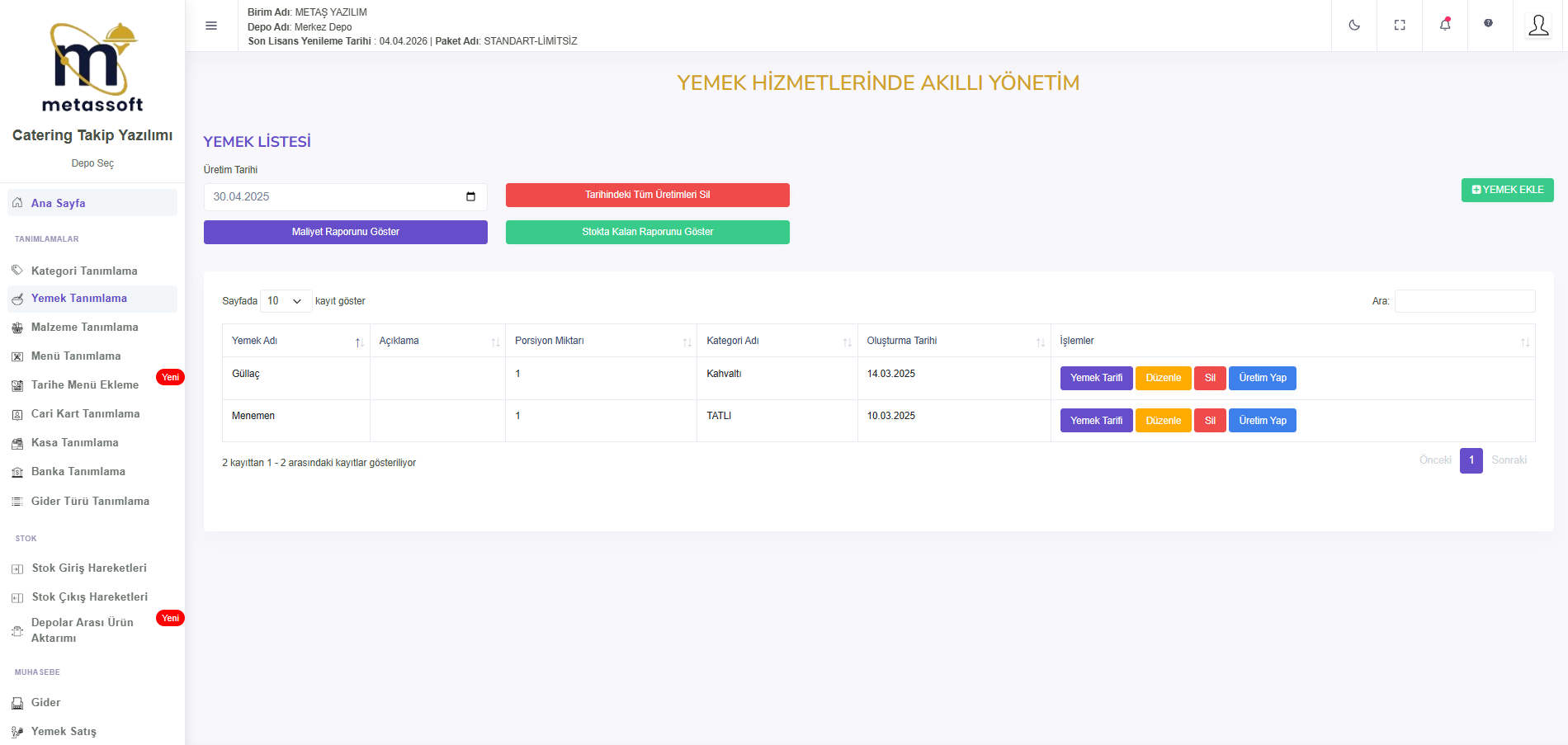 Belirlediğiniz Stok kartları ve gramajlarla istediğiniz yemekleri üretin.